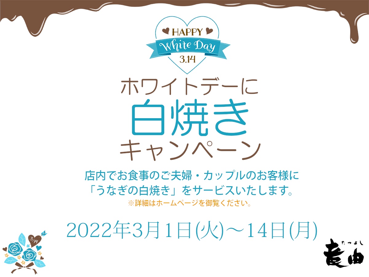 条件:ご注文の際に「ホワイトデーに白焼きキャンペーン」を見たよとお伝え下さい。